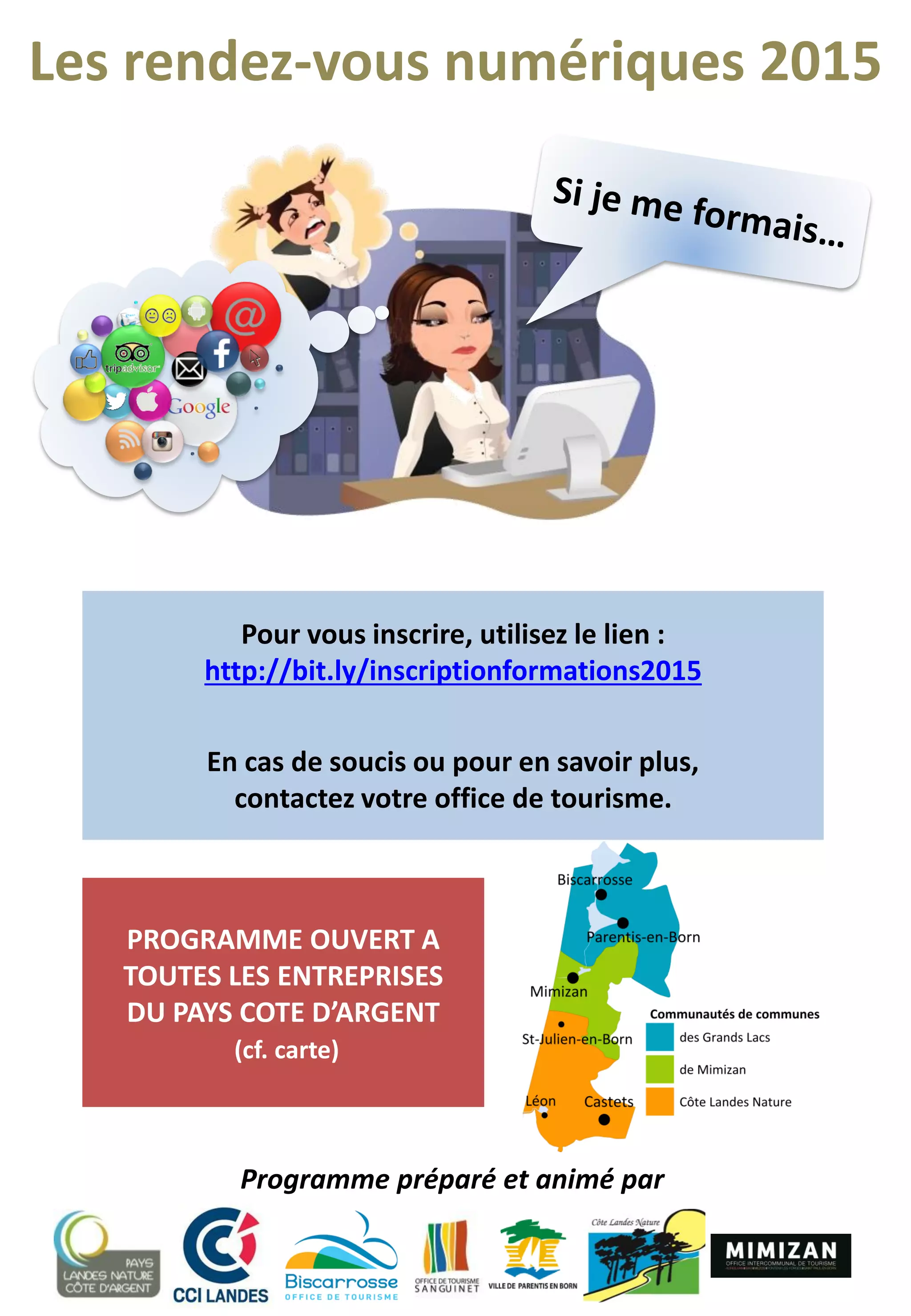Le document présente un programme de formation numérique pour 2015 destiné aux entreprises de la Côte d'Argent, avec plusieurs sessions de formation sur des sujets tels que l'accueil des clients anglophones, la gestion des réseaux sociaux et la retouche photo. Les formations sont accompagnées de la possibilité de prise en charge des coûts par la CCI, et les participants doivent s'inscrire via un lien fourni. Des formations complémentaires sont également proposées, avec des tarifs et des dates spécifiques.