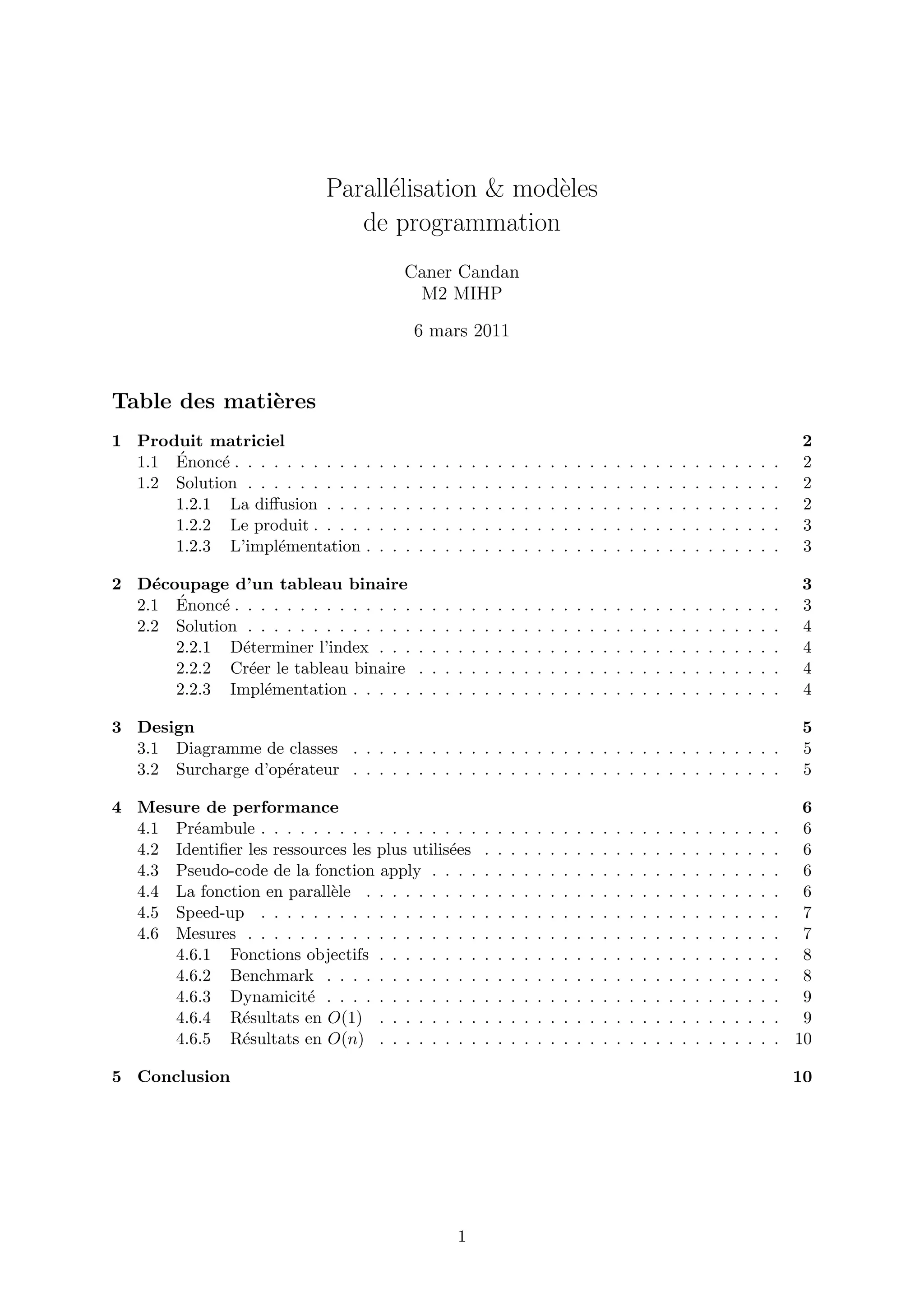 Le document aborde la parallélisation et les modèles de programmation, en se concentrant sur des algorithmes pour le produit matriciel et le tri d'un tableau binaire. Il propose des solutions détaillées avec des pseudo-codes, des implémentations en C++, et des considérations sur la performance. Le tout est structuré autour d'exemples concrets et de diagrammes illustrant le design des classes et l'utilisation d'OpenMP.