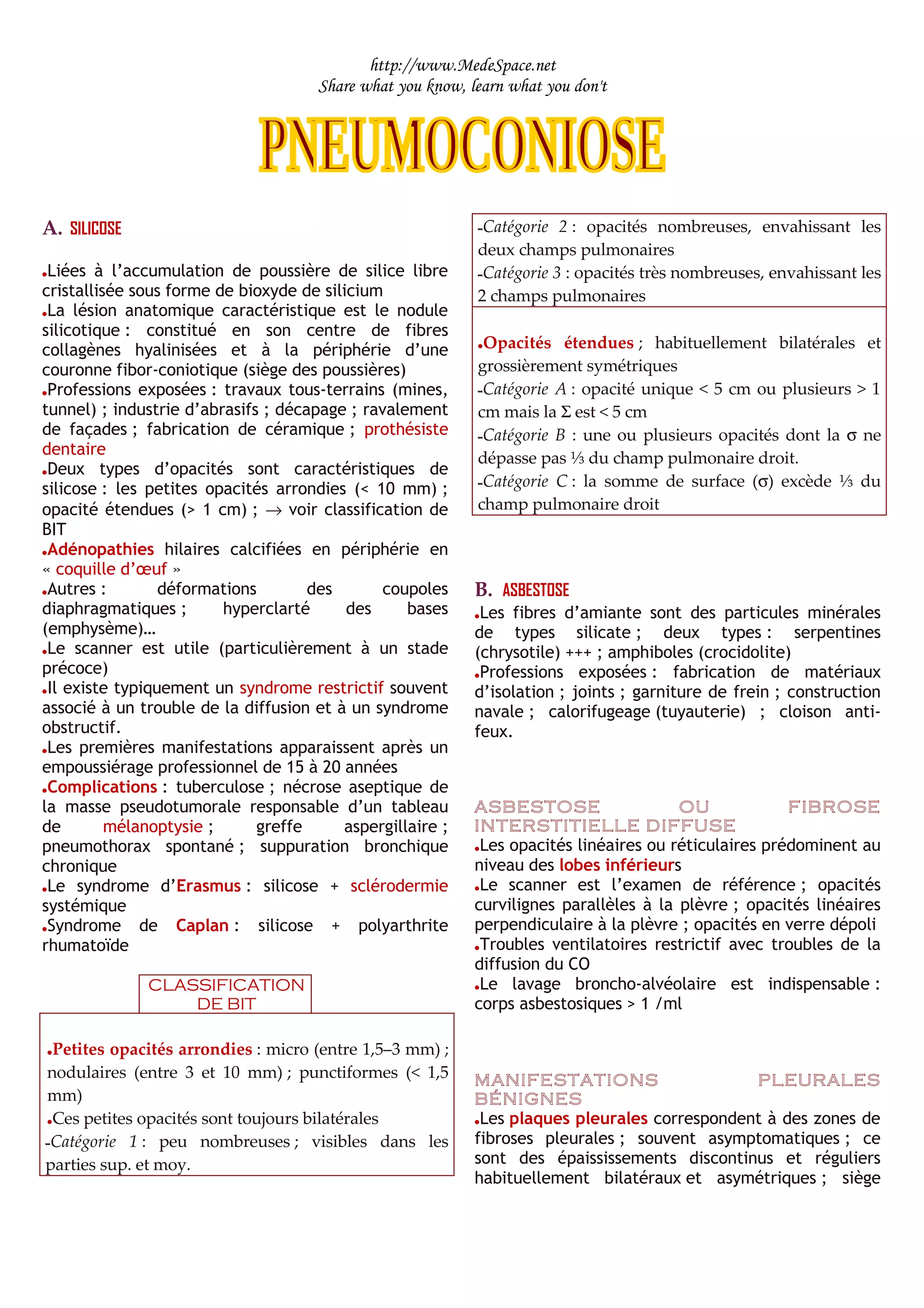 Le document traite des affections pulmonaires liées à l'exposition à la silice (silicose) et à l'amiante (asbestose). Il décrit les différents types d'opacités pulmonaires et leurs classifications, ainsi que les manifestations cliniques associées. Enfin, des méthodes diagnostiques comme le scanner et les examens broncho-alvéolaires sont mentionnées pour évaluer ces conditions pathologiques.