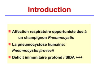La pneumocystose est une infection opportuniste causée par le champignon Pneumocystis jirovecii, particulièrement fréquente chez les personnes immunodéprimées, comme celles atteintes du VIH/SIDA. La transmission a lieu entre humains par inhalation d'aérosols, et l'évolution clinique peut varier de formes pulmonaires à extra-pulmonaires, souvent avec un pronostic sombre en cas de diagnostic tardif. Le traitement efficace repose sur le cotrimoxazole, et des mesures préventives sont essentielles pour limiter la contamination.