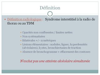 Le document traite des pneumopathies interstitielles diffuses, définissant les syndromes interstitiels et alvéolaires ainsi que les lésions associées. Il explore diverses étiologies, comprenant des causes connues et idiopathiques, ainsi que les bilans diagnostiques requis. Il mentionne également les résultats des examens fonctionnels respiratoires et des analyses spécifiques pour chaque type de pneumopathie.