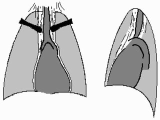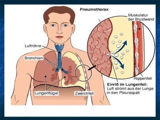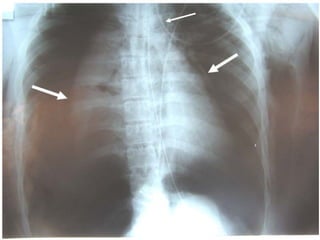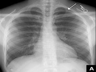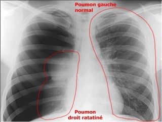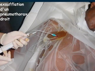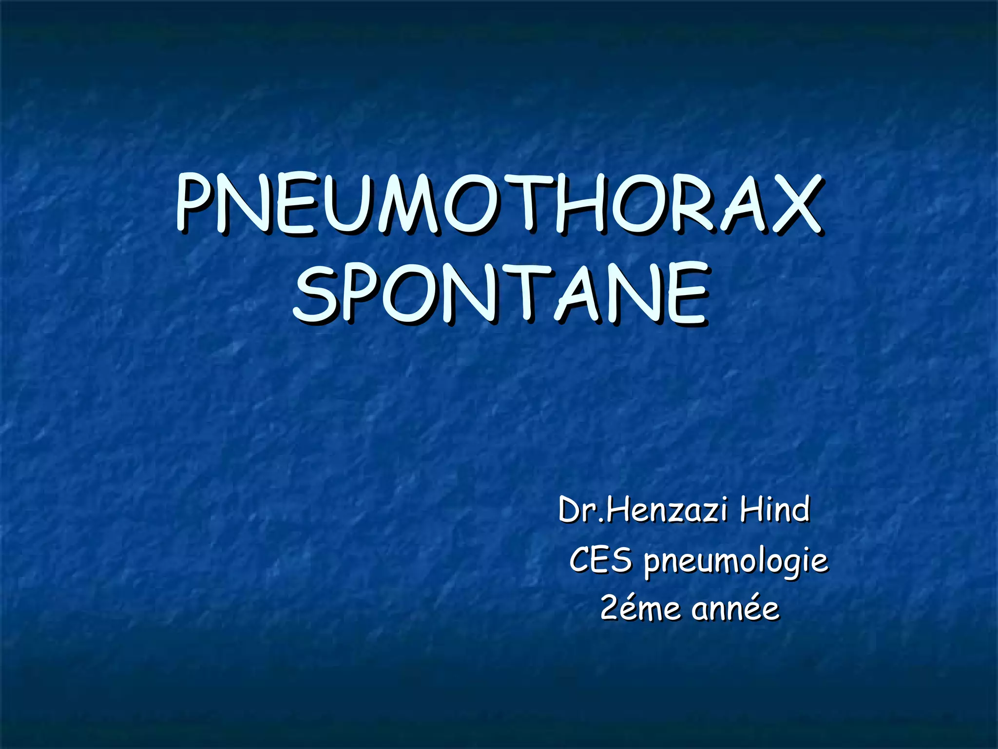 Le document traite du pneumothorax spontané, définissant ses types, diagnostics, et traitements. Il décrit les symptômes cliniques, les examens nécessaires à un diagnostic précis, ainsi que les complications potentielles et leur gestion. Le pneumothorax est souvent idiopathique chez les jeunes, présente des récidives fréquentes, et doit être traité de manière multidisciplinaire.