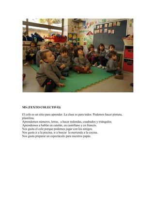 Le document décrit l'expérience scolaire positive d'enfants qui s'engagent dans diverses activités créatives et d'apprentissage tout en exprimant leur désir d'apprendre à lire et à écrire. Les élèves apprécient les moments passés en classe, sur le terrain de jeu, ainsi que les jeux et les spectacles qui favorisent l'amitié et l'apprentissage des langues. L'ensemble montre l'importance du jeu et de l'imagination dans l'éducation des jeunes enfants.
