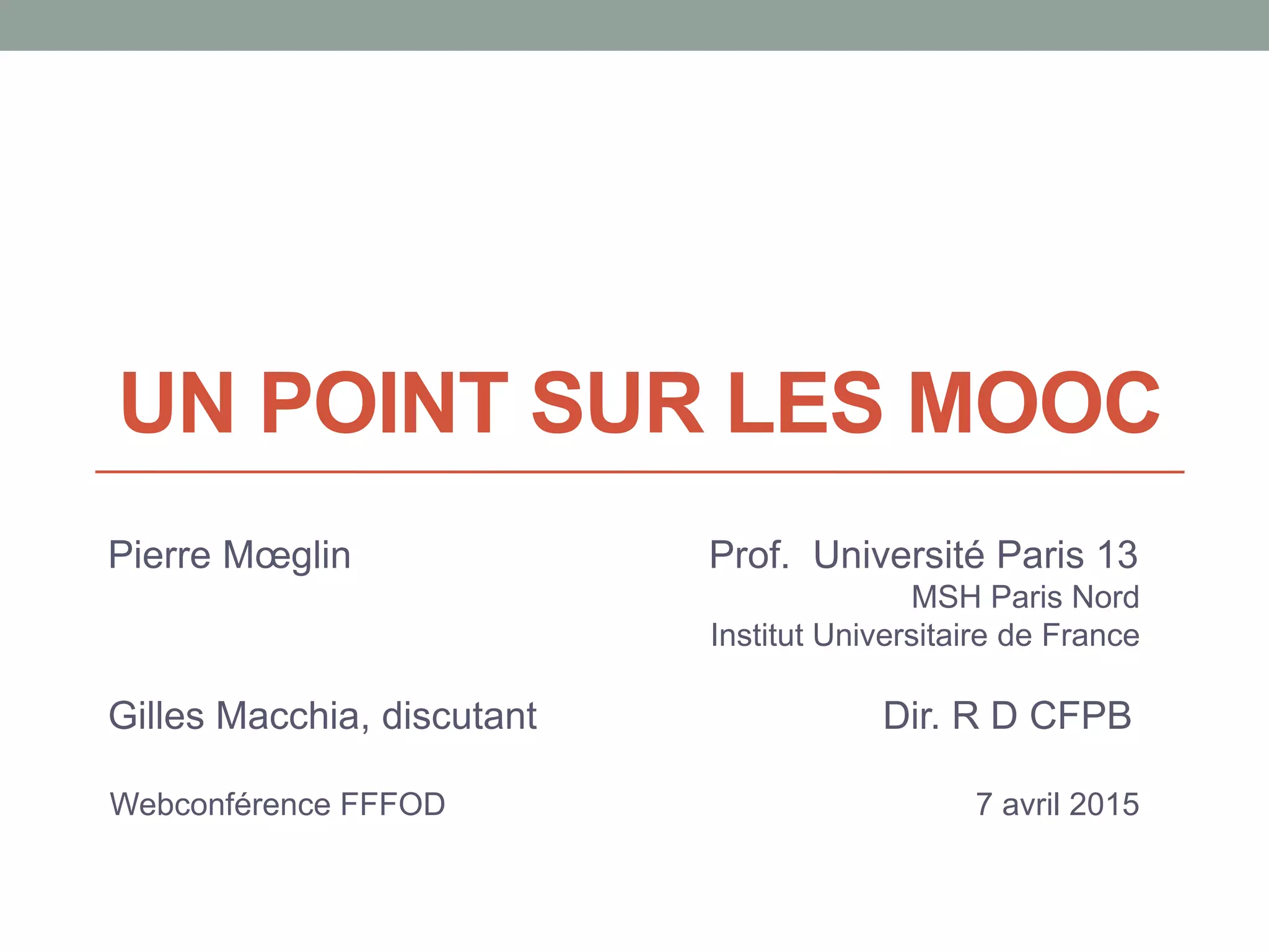 Le document traite des MOOC (Massive Open Online Courses), explorant leur définition, leur typologie, ainsi que leurs impacts sur l'éducation et le fonctionnement économique du secteur. Il soulève plusieurs questionnements concernant leur nouveauté, les débats qu'ils suscitent et leur potentiel de transformation de l'industrie éducative. Des tendances émergent autour des MOOC, telles que l'intermédiation, la personnalisation, et leur rôle dans la désinstitutionnalisation de la formation.