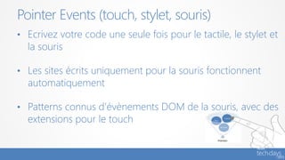 Le document présente le modèle des événements de pointeur d'IE10 et le polyfill Hand.js, permettant d'écrire du code unique pour les interactions tactiles, au stylet et avec la souris. Il décrit l'utilisation d'événements MSPointer et MSGesture pour gérer les interactions tactiles de manière unifiée et mentionne la spécification soumise par Microsoft au W3C. Des liens vers des démos et des articles supplémentaires sont fournis à la fin.