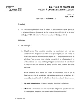 La politique visant à contrer le harcèlement à l'école nationale de police du Québec met en place des mesures pour assurer un environnement exempt de harcèlement, en protégeant l'intégrité physique et psychologique des membres du personnel et des étudiants. Elle définit le harcèlement, précise les étapes de dépôt et de traitement des plaintes, ainsi que les droits et le soutien offerts aux plaignants. Des mécanismes tels que la médiation et un comité de sensibilisation sont instaurés pour traiter les problèmes de harcèlement de manière juste et équitable.