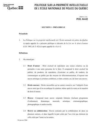 La politique sur la propriété intellectuelle de l'École nationale de police du Québec établit les droits et obligations liés aux créations générées par le personnel, en se fondant sur la loi sur le droit d'auteur. Elle stipule que l'école est généralement le premier titulaire des droits d'auteur pour les œuvres créées dans le cadre de l'emploi, tout en préservant les droits moraux des auteurs. Le document précise également les conditions de collaboration et les exceptions liées à la publication d'œuvres scientifiques.