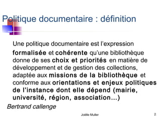 La politique documentaire est la formalisation des choix d'une bibliothèque en matière de collections, adaptée à son contexte et ses missions. Avec l'évolution numérique, elle s'oriente vers des services d'accompagnement des publics et non plus uniquement vers la gestion des collections physiques. La formalisation de ces choix devient essentielle pour le professionnalisme et la défense des budgets d'acquisition.