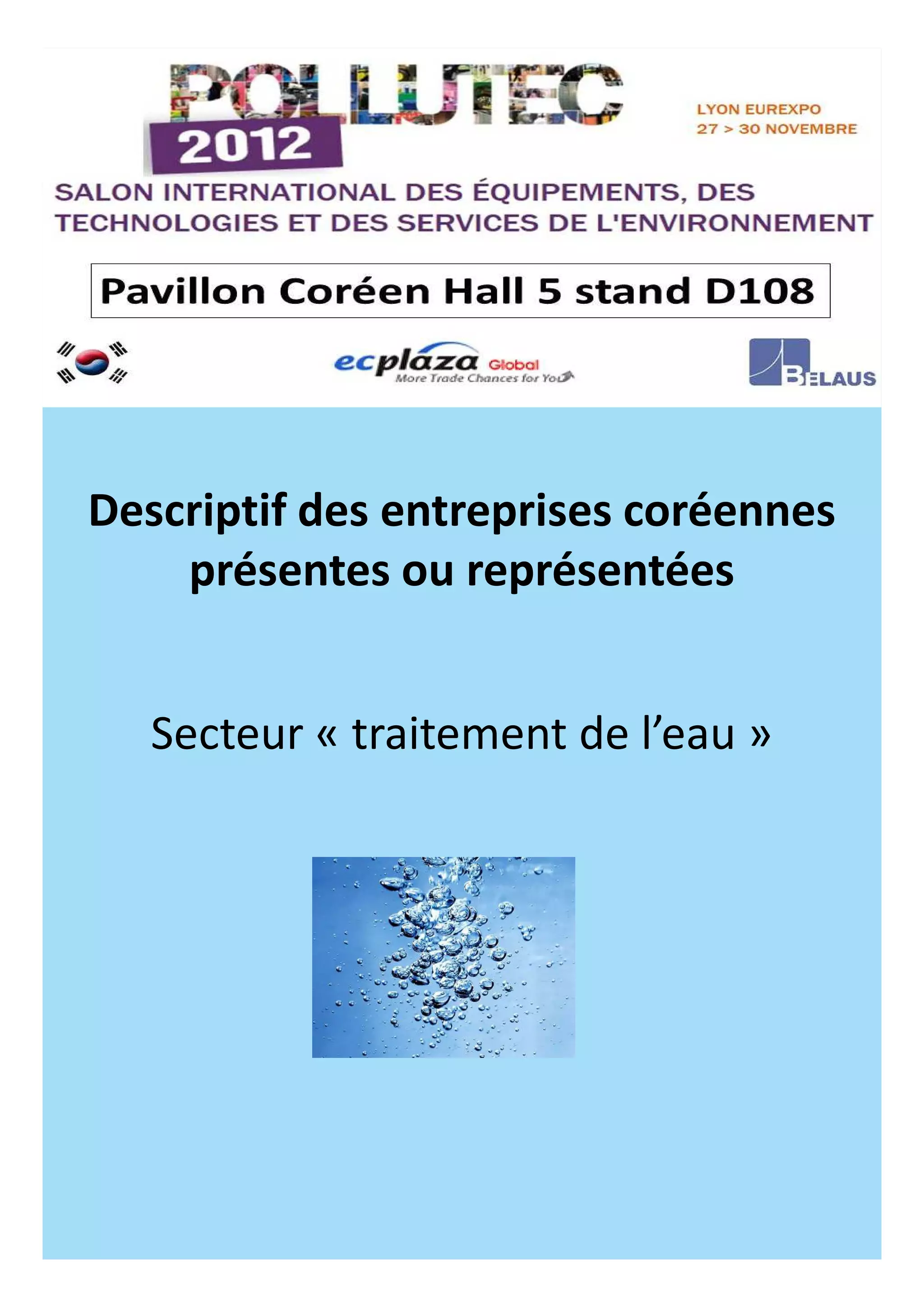 Le document présente diverses entreprises coréennes spécialisées dans le secteur du traitement de l'eau, chacune offrant des technologies innovantes pour la dépollution et l'épuration. Ces sociétés proposent des solutions variées, allant de la méthode Yan avec des biofilms à des dispositifs de désalinisation et de filtration, adaptées à différents types d'applications. L'ensemble des technologies vise une amélioration durable de la gestion de l'eau, en favorisant des pratiques respectueuses de l'environnement.