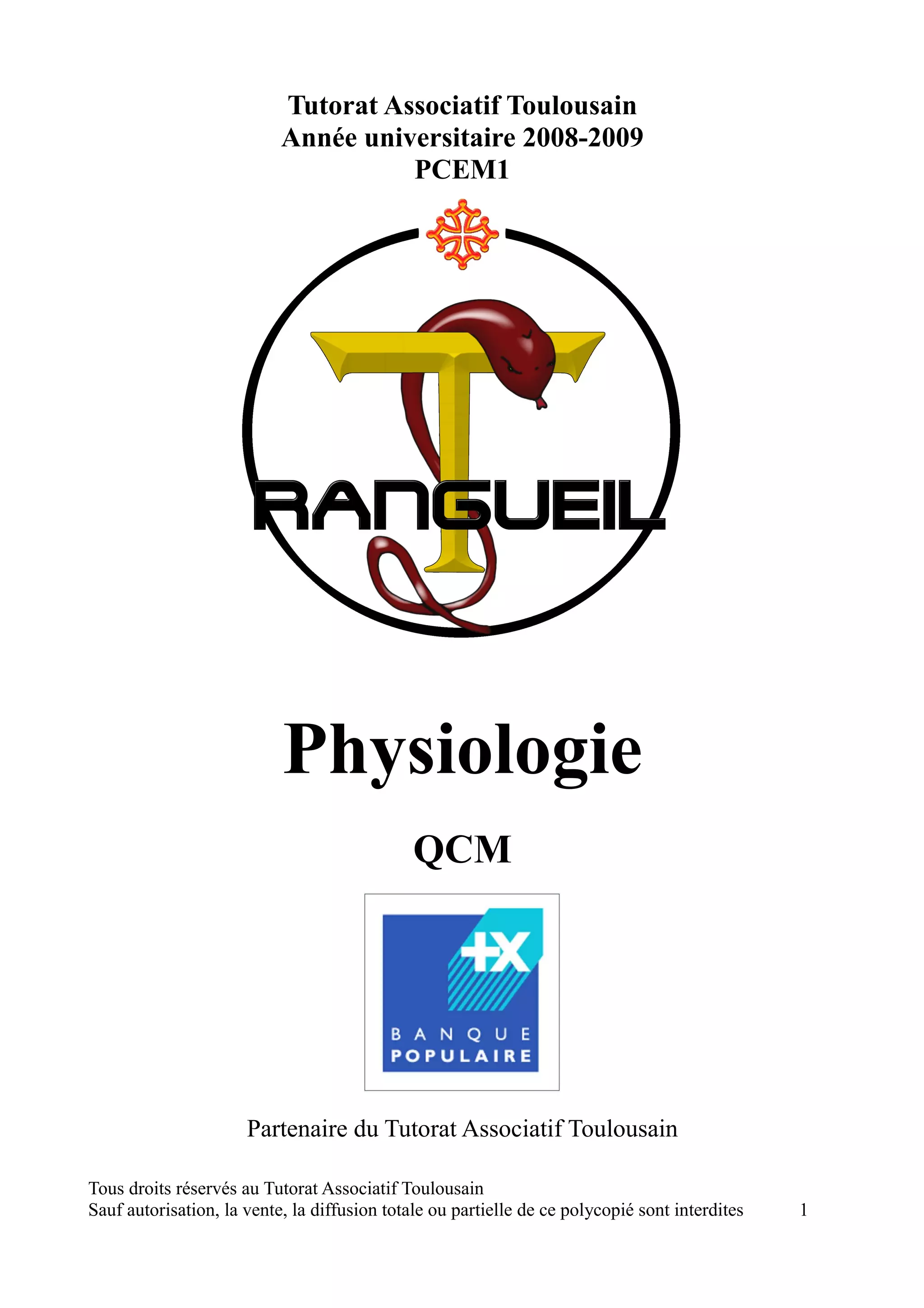 Le document est un polycopié de tutorat sur la physiologie pour des étudiants de médecine, couvrant divers aspects des compartiments liquidiens dans le corps humain, la réanimation médicale et des questions à choix multiples sur ces thèmes. Il aborde les concepts de l'homéostasie, des bilans hydriques, de la pression osmotique, et des échanges capillaires. Les droits de diffusion et de reproduction du contenu sont strictement réservés au tutorat associatif toulousain.