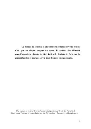 Ce document est un recueil de schémas d'anatomie du système nerveux central conçu pour accompagner le cours et faciliter la compréhension. Il couvre divers aspects de l'anatomie fonctionnelle, y compris les voies de la sensibilité, les structures corticales et les voies motrices. Une version couleur est également disponible en ligne sur le site des facultés de médecine de Toulouse.