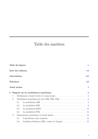 Ce document est un polycopié de cours pour les étudiants de Master 1 en télécommunications à l'Université Hassiba Benbouali de Chlef, couvrant les communications numériques avancées. Il aborde les modulations numériques, les transmissions en bande limitée, l'évaluation des systèmes de transmission numériques, ainsi que des canaux non idéaux et des techniques d'accès multiple. Il inclut également des exercices et des annexes sur le traitement du signal et des références bibliographiques.