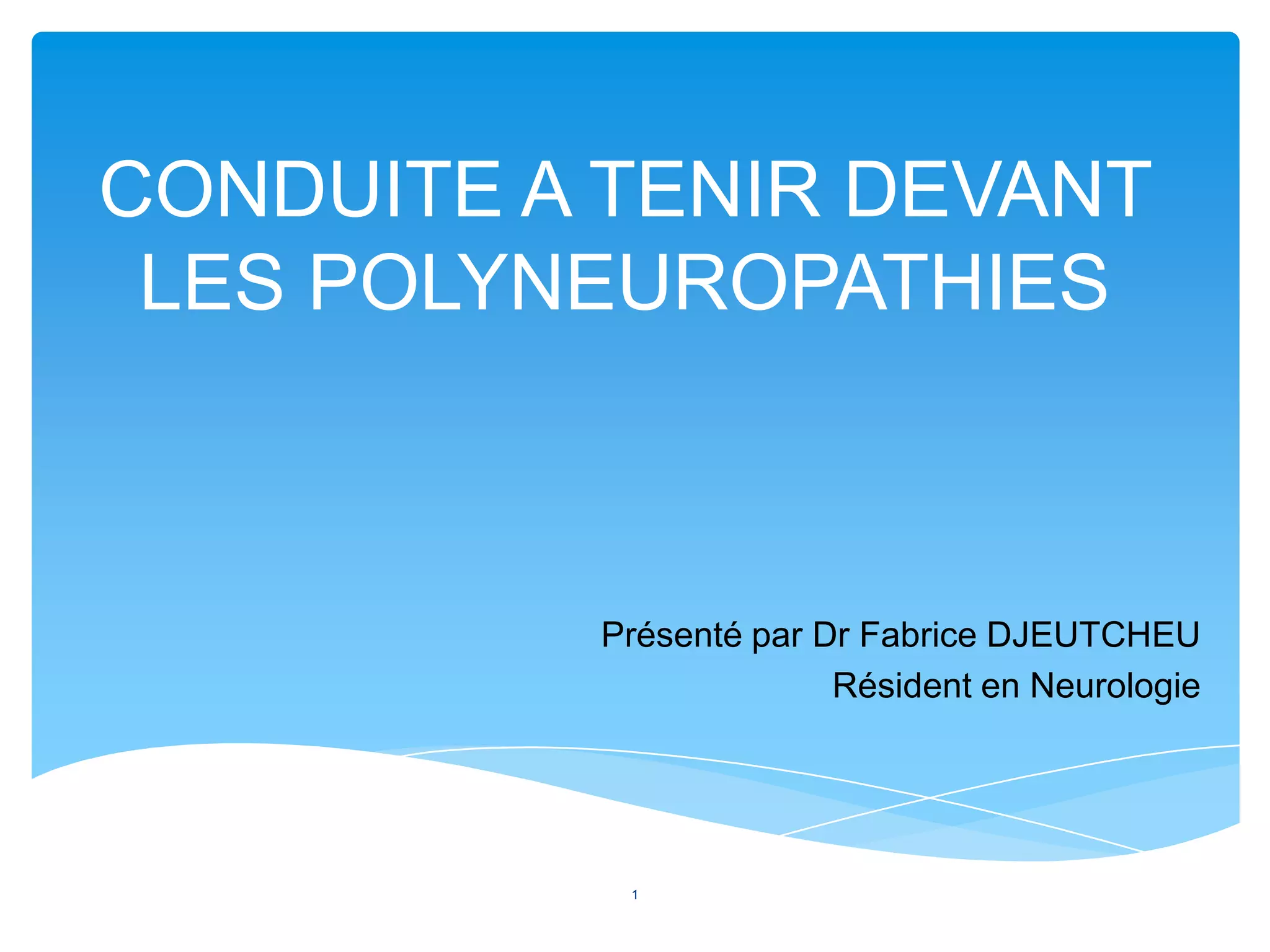 Le document présente une analyse approfondie des polyneuropathies, incluant leur physiopathologie, les diagnostics cliniques, et les approches thérapeutiques. Il souligne les étiologies courantes telles que le diabète et l'alcoolisme, ainsi que l'importance de l'électrophysiologie dans le diagnostic. Enfin, il propose des schémas de prise en charge étiologique pour diverses causes identifiées.