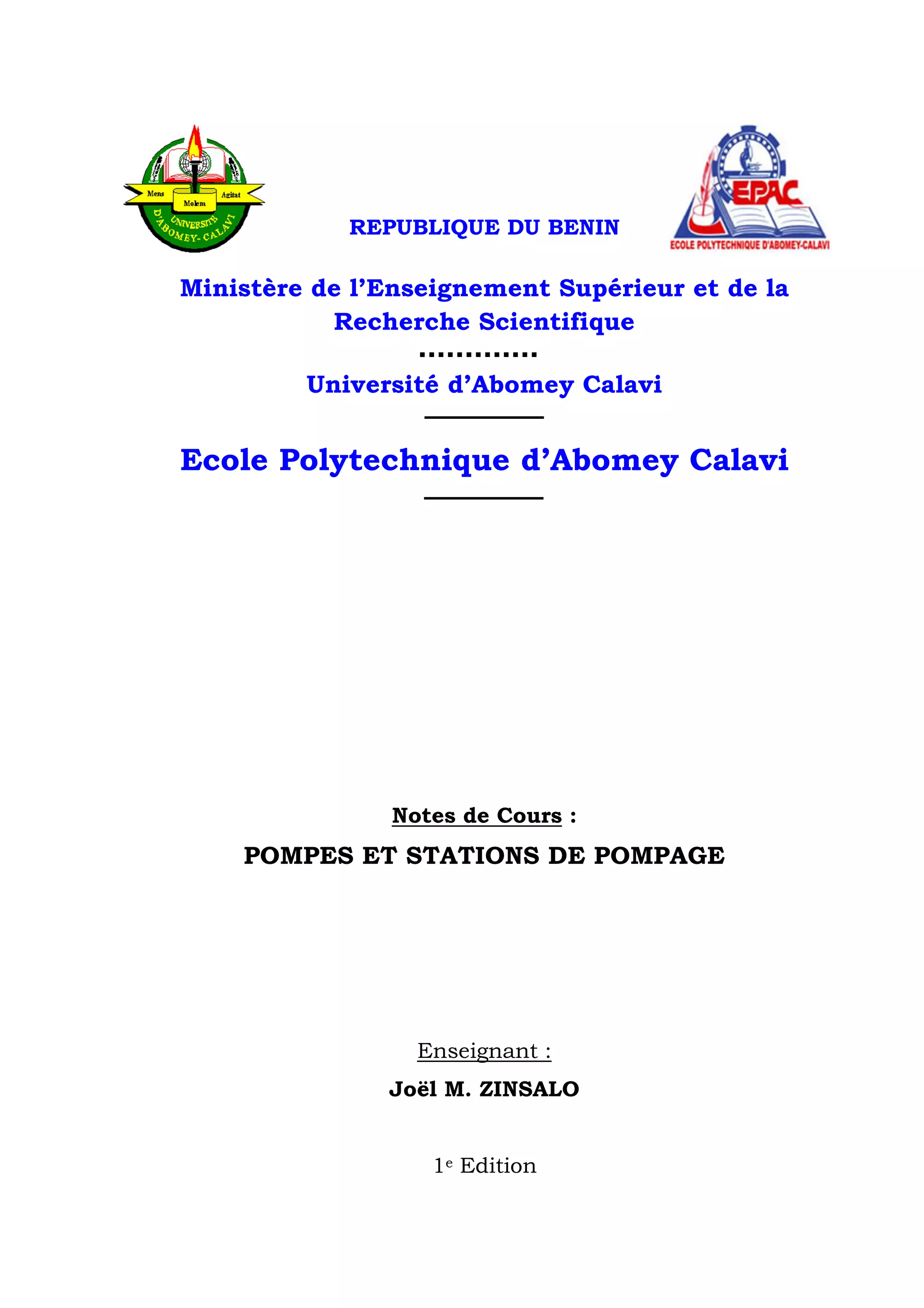 Le document est un cours sur les pompes et stations de pompage, enseigné par Joël M. Zinsalo à l'Université d'Abomey-Calavi. Il couvre les principes de fonctionnement des pompes, les différents types, leur classification, ainsi que les éléments nécessaires pour leur calcul et choix. À la fin du cours, l'étudiant doit être capable de décrire les pompes, sélectionner les équipements pertinents et comprendre la conception des stations de pompage.