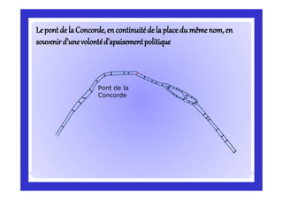 Le document traite de l'histoire du pont de la Concorde, qui relie les rives du VIIe et VIIIe arrondissement de Paris, à proximité de la place du même nom, située là où d'importantes exécutions avaient lieu durant la Terreur. Construit entre 1787 et 1791 par l'architecte Jean Rodolphe Perronet à l'aide de pierres de la Bastille, le pont a subi des rénovations entre 1930 et 1932 pour élargir sa structure tout en respectant le style néoclassique. Le texte évoque également les statues de grands hommes qui ornaient le pont et leur déplacement au cours de l'histoire.