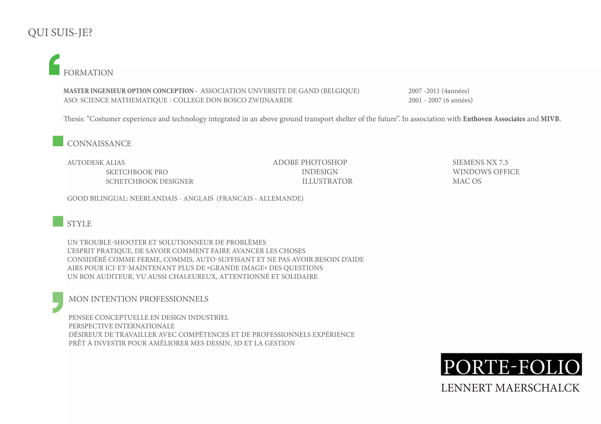 Lennert Maerschalck, diplômé d'un master en ingénierie avec une spécialisation en conception, a réalisé plusieurs projets innovants, dont la réingénierie d'un thermostat pour économiser de l'énergie et un abribus interactif utilisant des écrans AMOLED. Il possède des compétences en design industriel, prototypage et utilisation de divers logiciels comme Autodesk et Adobe. Doté d'une approche axée sur la résolution de problèmes, il se concentre sur l'amélioration de l'interaction utilisateur et de l'efficacité des produits dans le domaine des transports en commun.