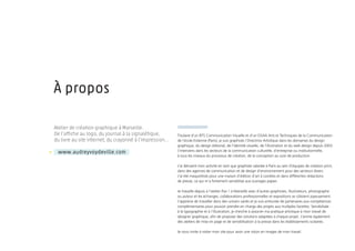 Audrey Voydeville est une graphiste indépendante basée à Marseille, spécialisée dans le design graphique, l'identité visuelle, et le web design depuis 2003. Elle collabore avec d'autres créatifs dans son atelier, participant à divers projets dans la communication culturelle et institutionnelle, tout en animant des ateliers de sensibilisation à la presse. Son portfolio inclut des travaux variés, allant de l'affiche au site internet, et elle a travaillé pour plusieurs institutions comme les musées nationaux et l'assistance publique des hôpitaux de Paris.