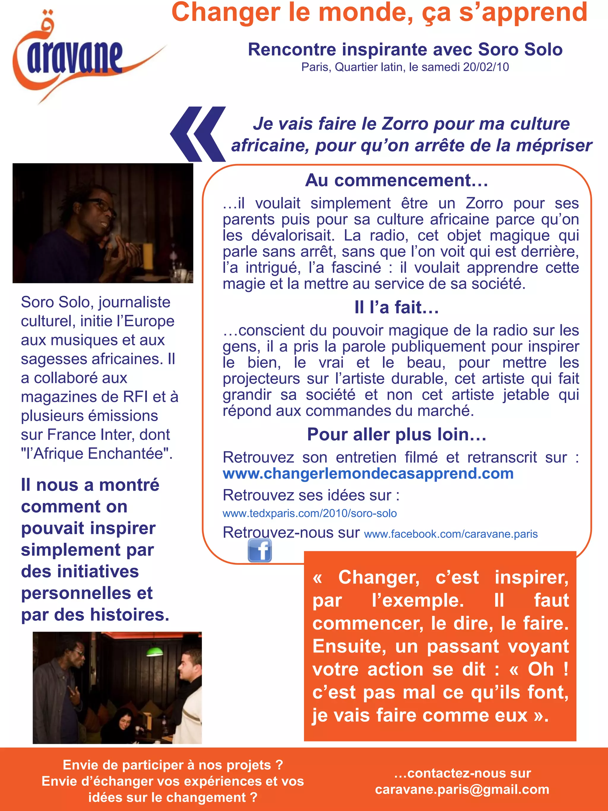 Le document présente une série de rencontres inspirantes avec divers intervenants qui partagent leurs expériences et réflexions sur la transformation sociale et culturelle. Chacun d'eux illustre comment leur engagement personnel et professionnel a contribué à des initiatives visant à changer les mentalités et à promouvoir la solidarité, l'éducation, le dialogue interculturel, et l'art au service de la société. Ces témoignages soulignent que le changement commence par des actions individuelles et une prise de conscience collective.