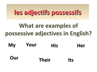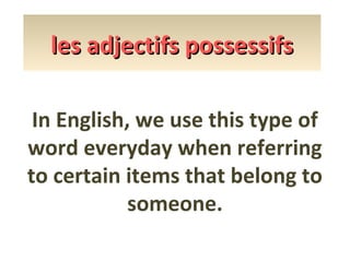 Le document explique l'utilisation des adjectifs possessifs en anglais et en français, en soulignant la manière dont ces adjectifs varient en fonction du genre et du nombre des noms. Il fournit des exemples concrets pour chaque type d'adjectif possessif en précisant les formes à utiliser selon le contexte. En outre, le document pose des questions incitatives pour réfléchir sur la mémorisation des adjectifs possessifs.