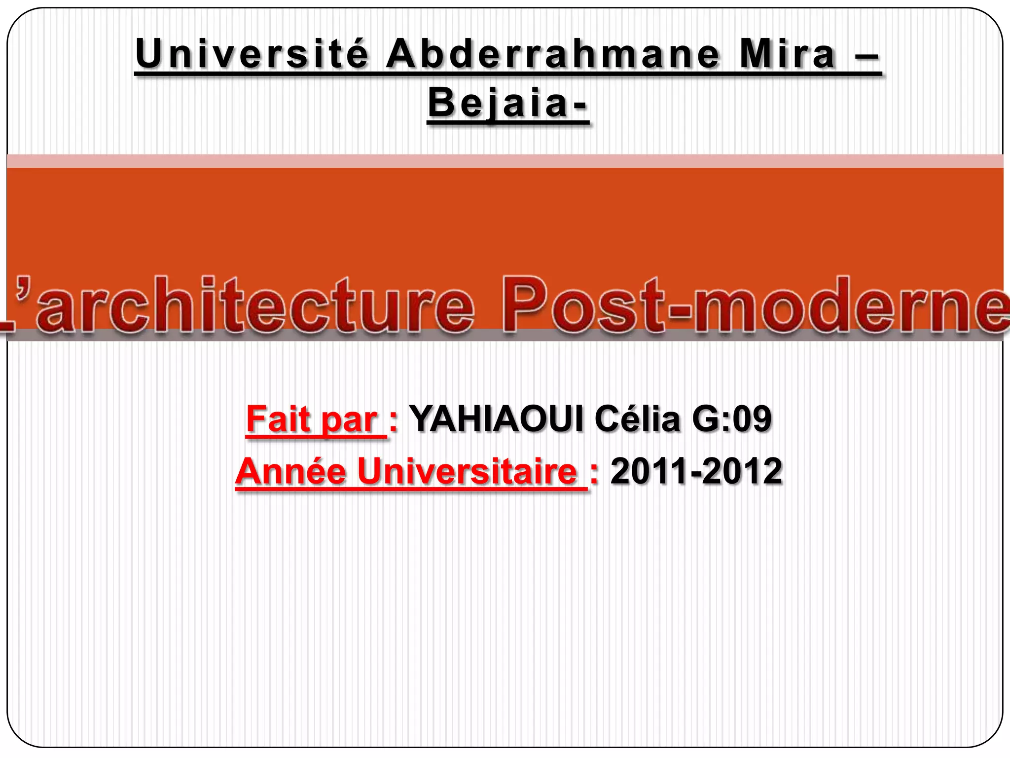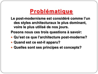 Le document traite de l'architecture post-moderne, son émergence dans les années 70, et ses caractéristiques clés, telles que le retour à l'éclectisme et l'utilisation de références historiques. Il souligne également la distinction entre les points de vue modernistes et post-modernistes sur l'ornementation et la fonctionnalité. Enfin, il conclut que le post-modernisme favorise la complexité et l'originalité dans la conception architecturale.