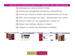 Le document présente l'importance des réseaux sociaux pour les hôtels, en mettant en avant Google+ et Foursquare comme des outils essentiels pour acquérir et fidéliser des clients. Google+ permet une intégration complète avec Google, tandis que Foursquare offre des fonctionnalités intéressantes comme des offres spéciales et un système de gamification pour les clients. Twitter, bien que moins efficace pour les hôtels, est un réseau à surveiller pour sa popularité croissante et son potentiel pour attirer l'attention des médias.