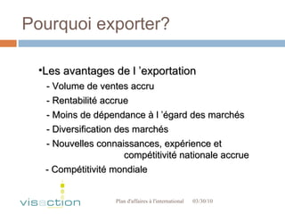 Le document présente un plan d'affaires à l'international, mettant en évidence l'importance d'un plan d'exportation pour les entreprises. Il aborde les opportunités et défis liés à l'exportation, ainsi que les étapes et le contenu nécessaires à l'élaboration d'un plan d'exportation structuré. Enfin, il cible à la fois les entreprises novices et celles établies cherchant à se développer sur de nouveaux marchés.