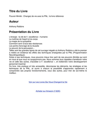 Le livre 'Pouvoir illimité' d'Anthony Robbins présente les techniques de la programmation neurolinguistique (PNL) pour aider les individus à réaliser leur potentiel. Il démontre comment maîtriser l'esprit et le corps peut conduire à l'excellence personnelle et à des améliorations de vie. Robbins, un coach renommé, rend ces concepts accessibles pour que chacun puisse comprendre et optimiser ses propres fonctionnements.