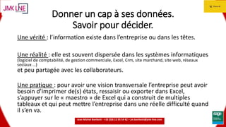 Le document aborde l'importance des données pour les PME afin de prendre des décisions éclairées. Il souligne les défis liés à la dispersion de l'information dans divers systèmes et propose des outils comme Microsoft Power BI pour améliorer l'autonomie et l'efficacité dans la gestion des données. Enfin, il présente des options tarifaires pour différentes solutions d'analyse de données.