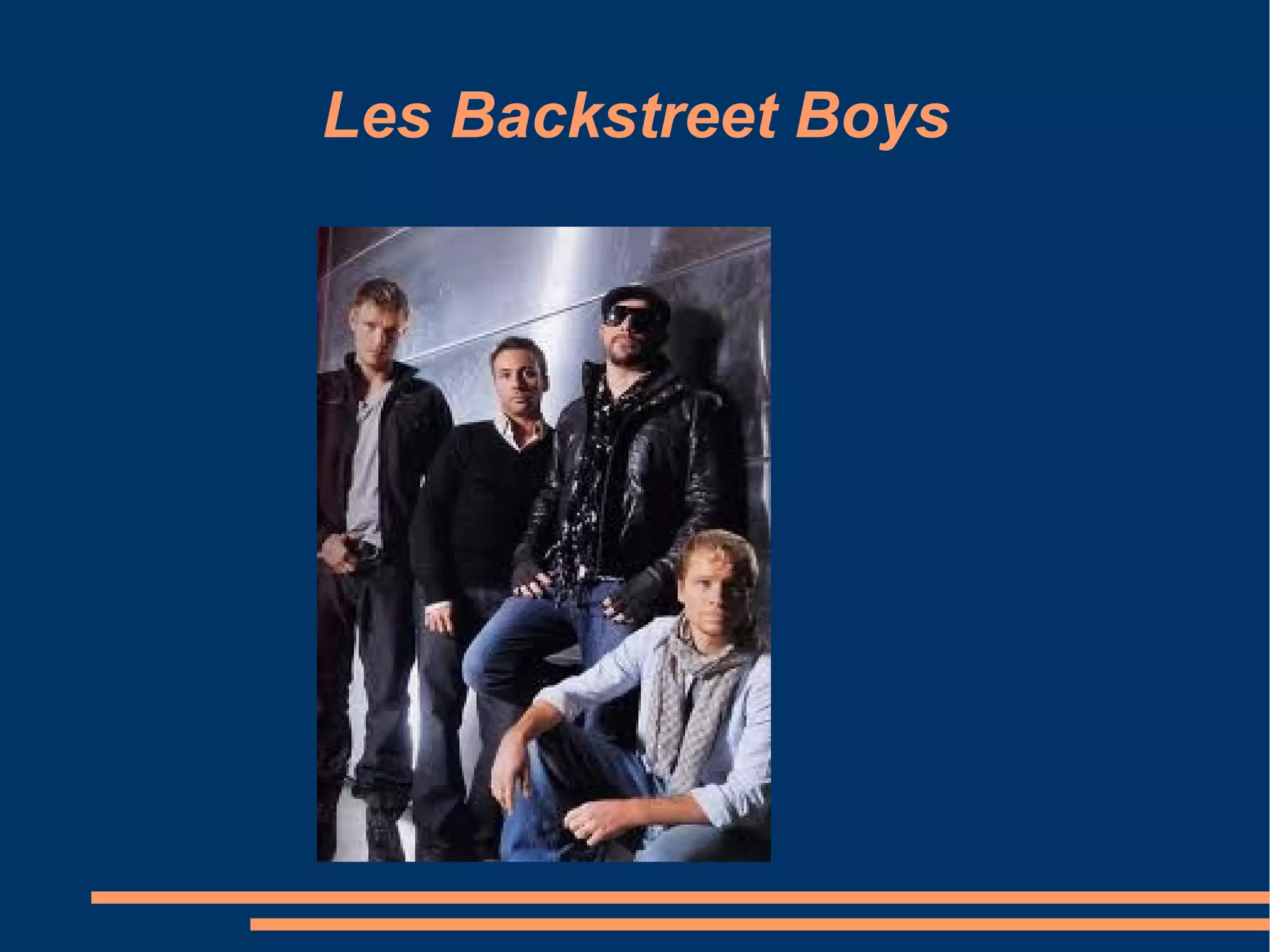 Les Backstreet Boys sont un boys band américain formé en 1993, vendu à plus de 130 millions d'albums et ayant remporté de nombreux prix. Le groupe est composé de Nick Carter, Brian Littrell, A.J. McLean, Howie Dorough et Kevin Richardson. Ils sont reconnus comme l'un des groupes les plus vendus de l'histoire de la musique, avec leurs sept premiers albums atteignant le top 10 de Billboard.