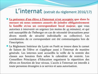 Le document fournit des informations sur les règles et horaires de l'internat, y compris la nécessité de fournir un coordinateur en cas d'urgence. Il mentionne également les activités disponibles, les procédures pour les sorties, et les responsabilités des élèves concernant la propreté et la sécurité des lieux. Les règles de conduite, y compris les interdictions concernant l'alcool et le tabac, ainsi que l'utilisation des technologies, sont également abordées.