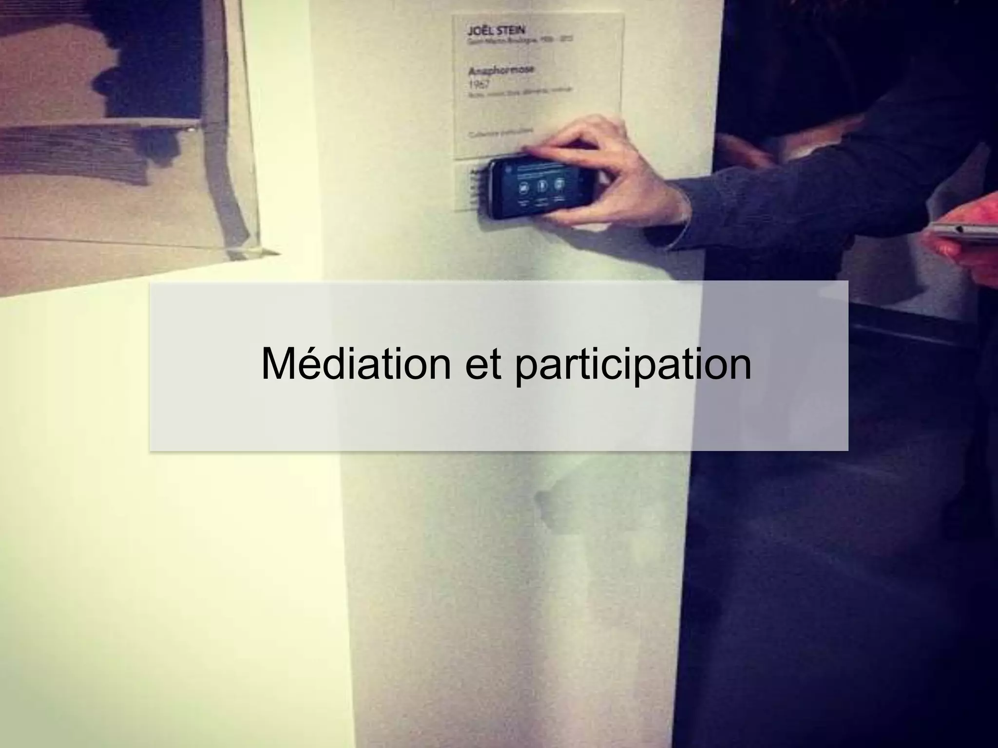 Le document traite de l'importance de la médiation et de la participation dans le contexte du Grand Palais et des réseaux sociaux. Il souligne comment ces plateformes permettent de rendre l'expérience muséale plus interactive et attractives, en incluant la participation des visiteurs via des avis et des contenus partagés. Enfin, il met en avant l'utilisation de supports pédagogiques variés et l'importance d'attirer de nouveaux publics grâce à des activités ludiques et engageantes.