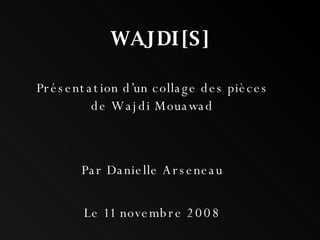 Wajdi Mouawad est un dramaturge libanais dont les œuvres explorent des thèmes d'identité, de guerre et de souffrance, souvent à travers des récits familiaux. Influencé par le post-modernisme et son mentor Robert Lepage, il utilise des métaphores et des fantasmes scéniques pour enrichir ses créations. Son théâtre pose des questions sur l'identité et l'essence de l'être.