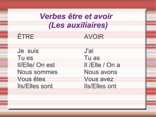 Le document traite de la conjugaison des verbes au présent, en particulier des verbes 'être' et 'avoir', ainsi que de divers groupes de verbes en -er, -ir et -re. Il présente des différences de radical selon le nombre et les règles spécifiques pour certains verbes réguliers et irréguliers. La structure des conjugaisons est décrite de manière détaillée pour chaque groupe de verbes.