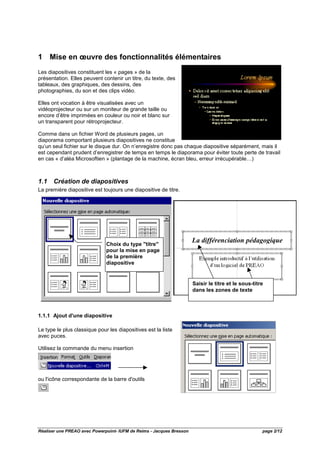 Ce document présente un guide sur l'utilisation des fonctionnalités de PowerPoint pour réaliser une présentation efficace. Il couvre des sujets tels que la création, la modification et l'animation des diapositives, ainsi que la gestion des transitions et des hyperliens. Les conseils visent à améliorer la présentation visuelle et l'impact des diaporamas tout en assurant une bonne organisation des contenus.