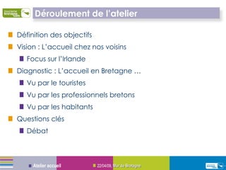 L'atelier sur l'accueil en Bretagne, tenu le 6 février 2009, a examiné les perceptions et expériences des touristes, des professionnels et des habitants concernant l'accueil en région. Les résultats ont révélé des atouts tels qu'une forte identité bretonne et une hospitalité chaleureuse, tout en identifiant des faiblesses comme la difficulté de communication en langues étrangères et des infrastructures insuffisantes. Des questions clés ont été soulevées pour améliorer l'accueil, notamment la mobilisation des commerçants et la performance des offices de tourisme.
