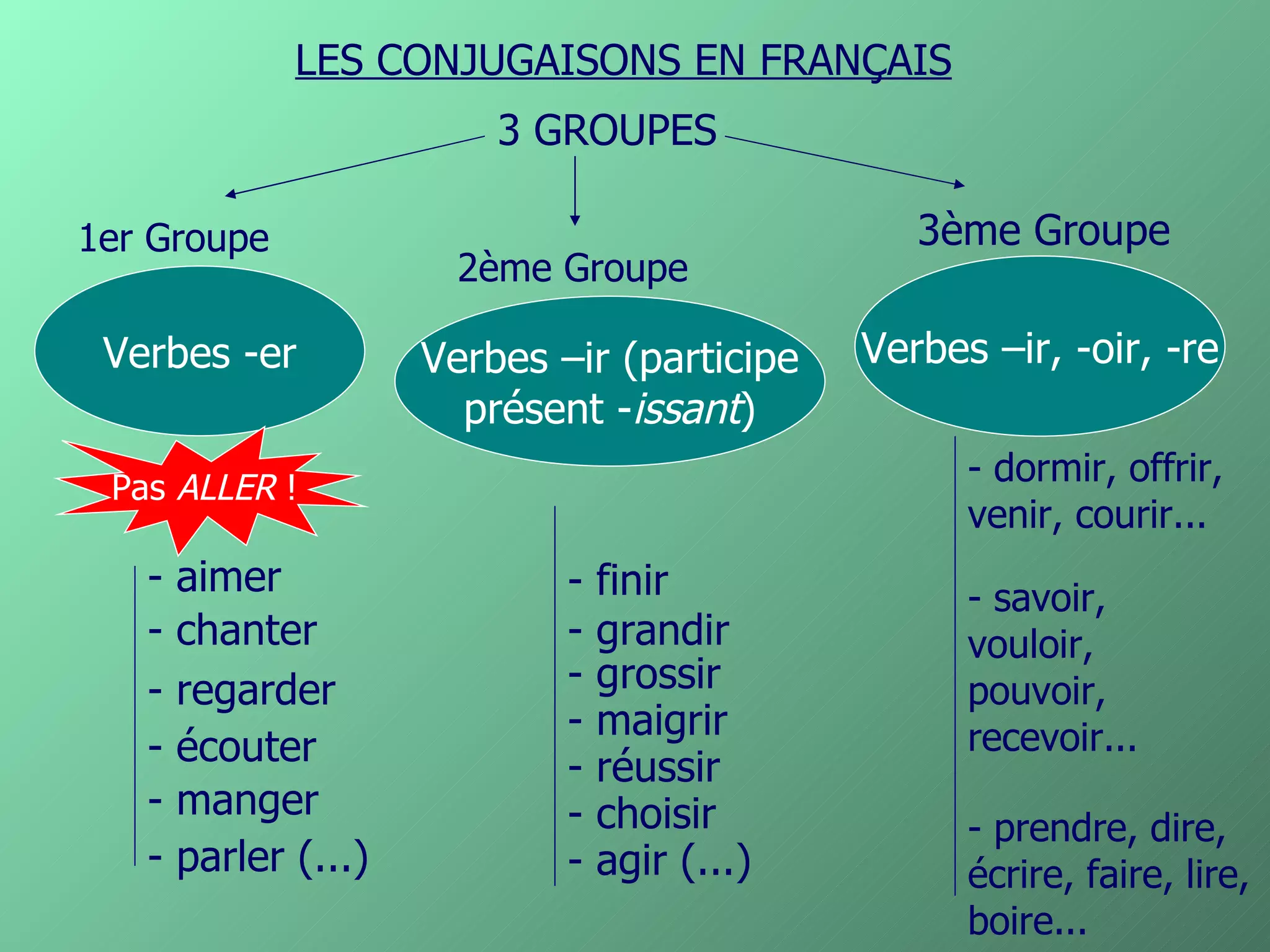 Le document présente les conjugaisons des verbes français, classés en trois groupes : le premier groupe avec des verbes en -er, le deuxième groupe avec des verbes en -ir, et le troisième groupe comprenant des verbes irréguliers. Chaque groupe met en lumière les variations orthographiques, les terminaisons régulières et fournit des exemples pratiques de conjugaisons. Des exercices sont également proposés pour aider à maîtriser les conjugaisons de ces verbes.