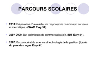 Noranie Ipakala possède un parcours académique en commerce avec un master en vente et mercatique, un DUT en techniques de commercialisation et un baccalauréat en gestion. Elle a acquis de l'expérience professionnelle en tant que conseillère en formation, stagiaire commerciale et réceptionniste, avec des compétences en prospection, fidélisation et gestion de la clientèle. Ses compétences informatiques incluent de bonnes bases en Word, Excel et PowerPoint.