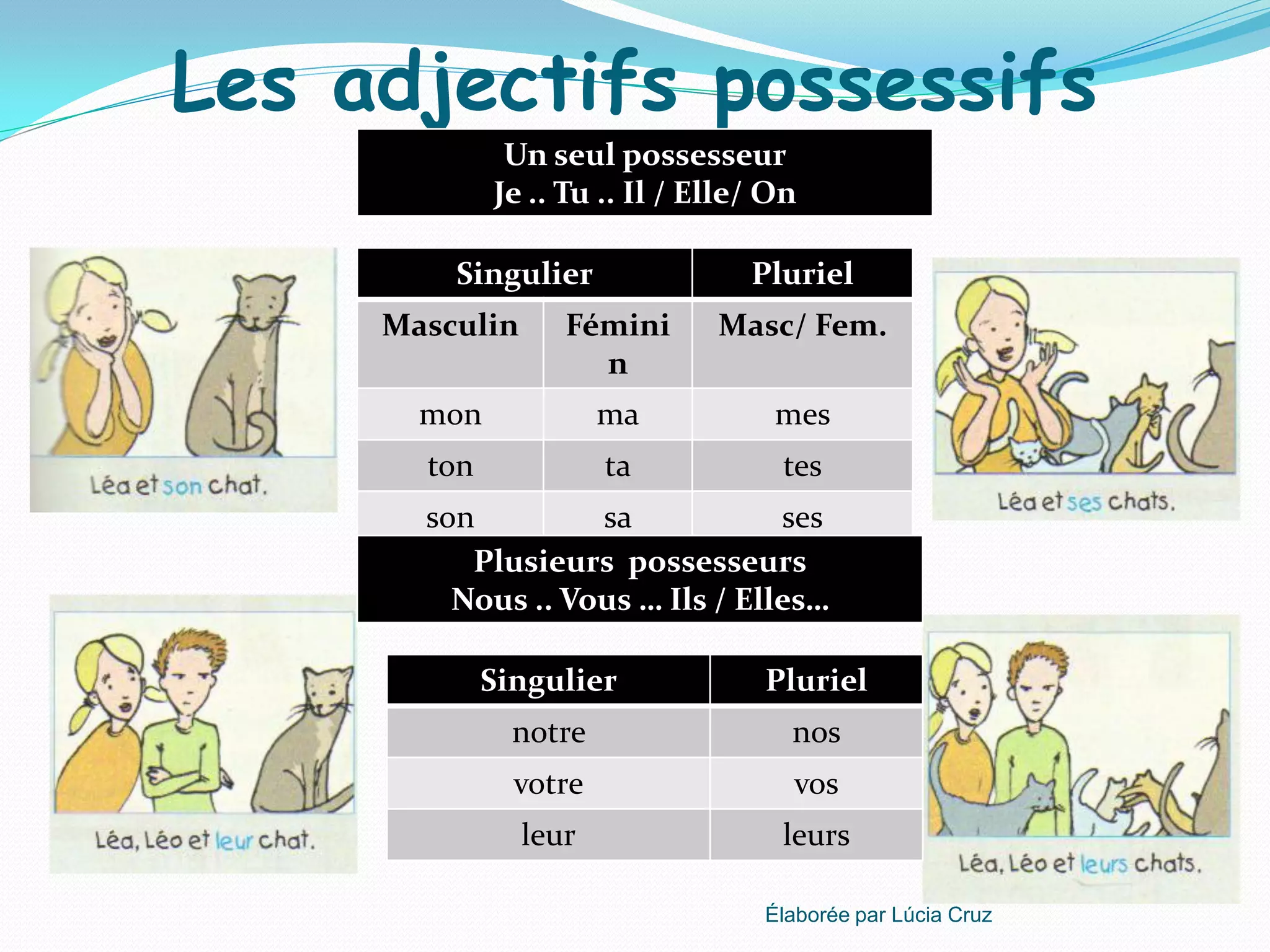 Le document présente les adjectifs et pronoms possessifs en français, expliquant leur accord en genre et en nombre selon le possesseur. Il fournit également des exemples d'utilisation pour clarifier leur emploi. Élaborée par Lucia Cruz, la synthèse est à la fois pédagogique et informative.