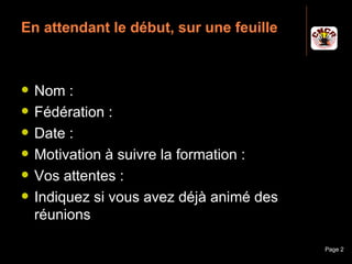Le document présente les techniques d’animation de réunions destinées aux leaders du CNCR. Il aborde les principes d’efficacité, les types de réunions, ainsi que les étapes de planification et de conduite des réunions, tout en soulignant le rôle crucial de l'animateur. Des exercices pratiques et des critères de réussite sont également inclus pour renforcer ces compétences.