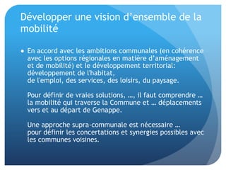 Le plan communal de mobilité à Genappe vise à développer une vision intégrée de la mobilité en cohérence avec les ambitions locales et régionales, en tenant compte de l'augmentation prévue de la population et des trajets domicile-travail. Une démarche participative est prévue pour impliquer les citoyens dans l'élaboration du plan, avec des ateliers et des consultations pour recueillir des idées et des priorités. Les objectifs incluent la création d'infrastructures durables et l'amélioration de l'accessibilité, tout en cherchant à renforcer la cohésion sociale et à répondre aux besoins de transport actuels et futurs.