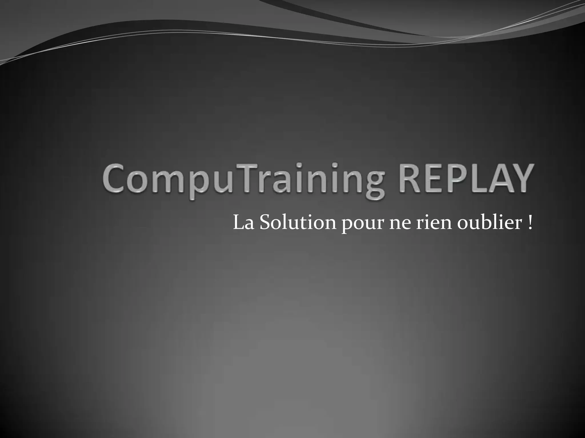 Computraining Replay est une solution d'apprentissage pour les programmes Microsoft Office, offrant des vidéos explicatives et un accès gratuit pendant 3 mois. Il permet une utilisation facile sur divers appareils et inclut des avantages tels qu'une carte de visite personnalisée. Cette solution vise à aider les utilisateurs à ne rien oublier après leur formation.