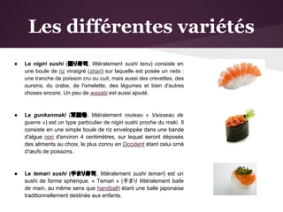 Le document présente la cuisine japonaise en se concentrant sur les différents types de sushi, tels que le nigiri, le maki, le temaki et le sashimi, ainsi que sur des variétés modernes comme le California roll. Il souligne également l'importance de l'art culinaire dans la préparation des sashimis et l'utilisation de couteaux japonais de qualité. Enfin, il décrit le concept des sushi bars, où les assiettes sont servies sur un tapis roulant, permettant aux clients de choisir leurs plats.