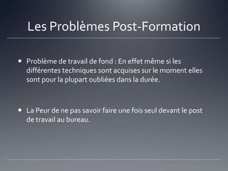 Le document aborde les problèmes rencontrés après les formations, notamment l'oubli des techniques acquises et la crainte de les appliquer seul. Il propose une solution innovante via un QR code sur une carte, permettant aux employés d'accéder à des vidéos de formations pendant 3 mois. Cette méthode assure un accompagnement continu et une révision rapide des compétences apprises.