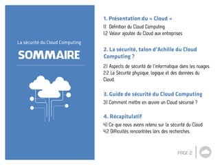 Le document traite des services de cloud computing, soulignant leur flexibilité, leur coût initial faible, et leur capacité d'adaptation rapide aux changements du marché. Il aborde également les questions de sécurité, notamment la gestion des accès, le cryptage des données, et la nécessité d'exiger des garanties des fournisseurs. Enfin, il souligne l'absence d'informations sur l'évaluation des coûts de sécurisation du cloud pour les entreprises.