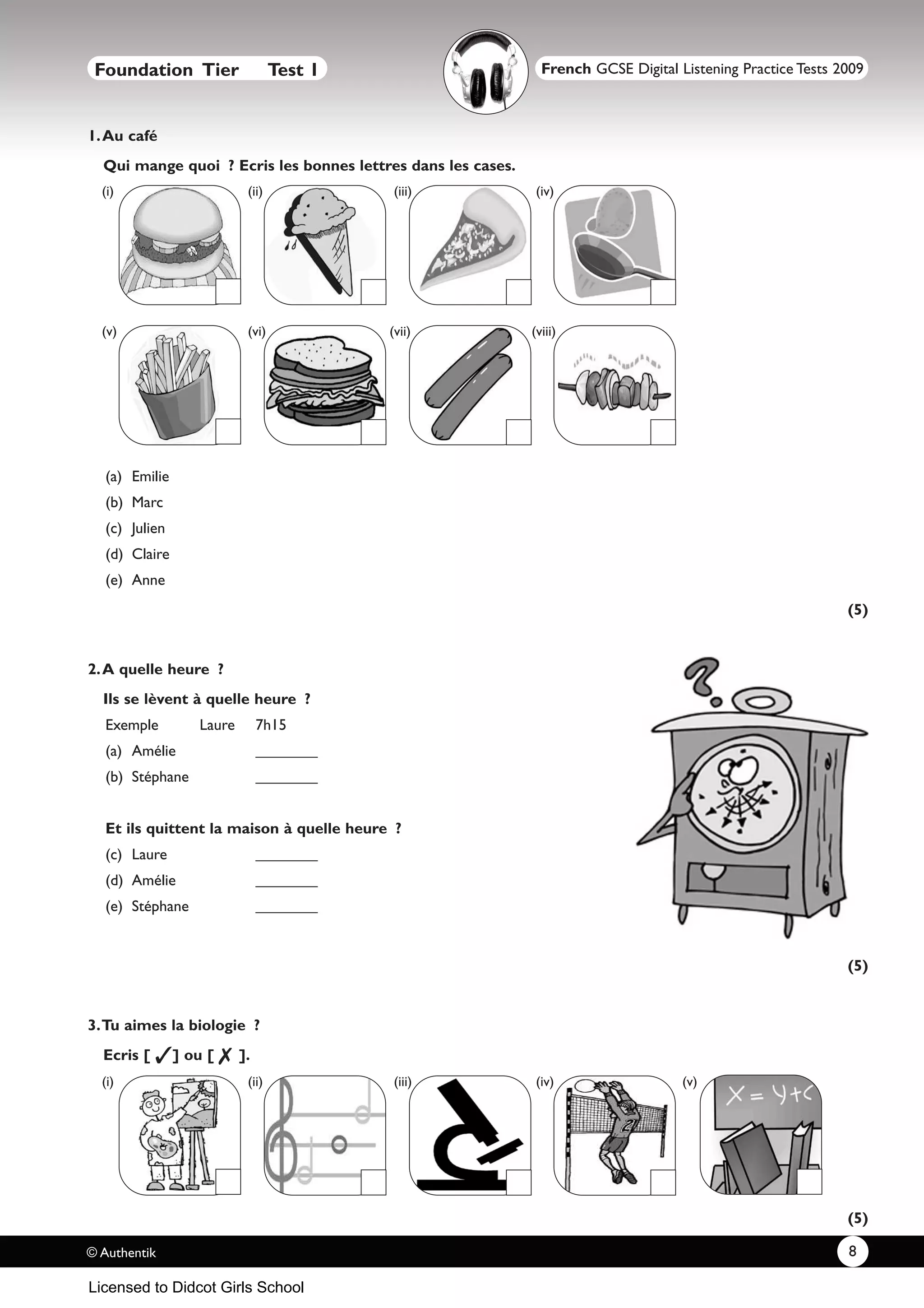 Le document est un test d'écoute numérique de niveau fondation pour le GCSE de français, comprenant des exercices autour de situations quotidiennes comme les repas, les horaires, et une conversation téléphonique. Il inclut des activités telles que remplir des cases avec des lettres, répondre à des questions et compléter des listes d'ingrédients. Les exercices sont conçus pour évaluer la compréhension orale des étudiants en français.