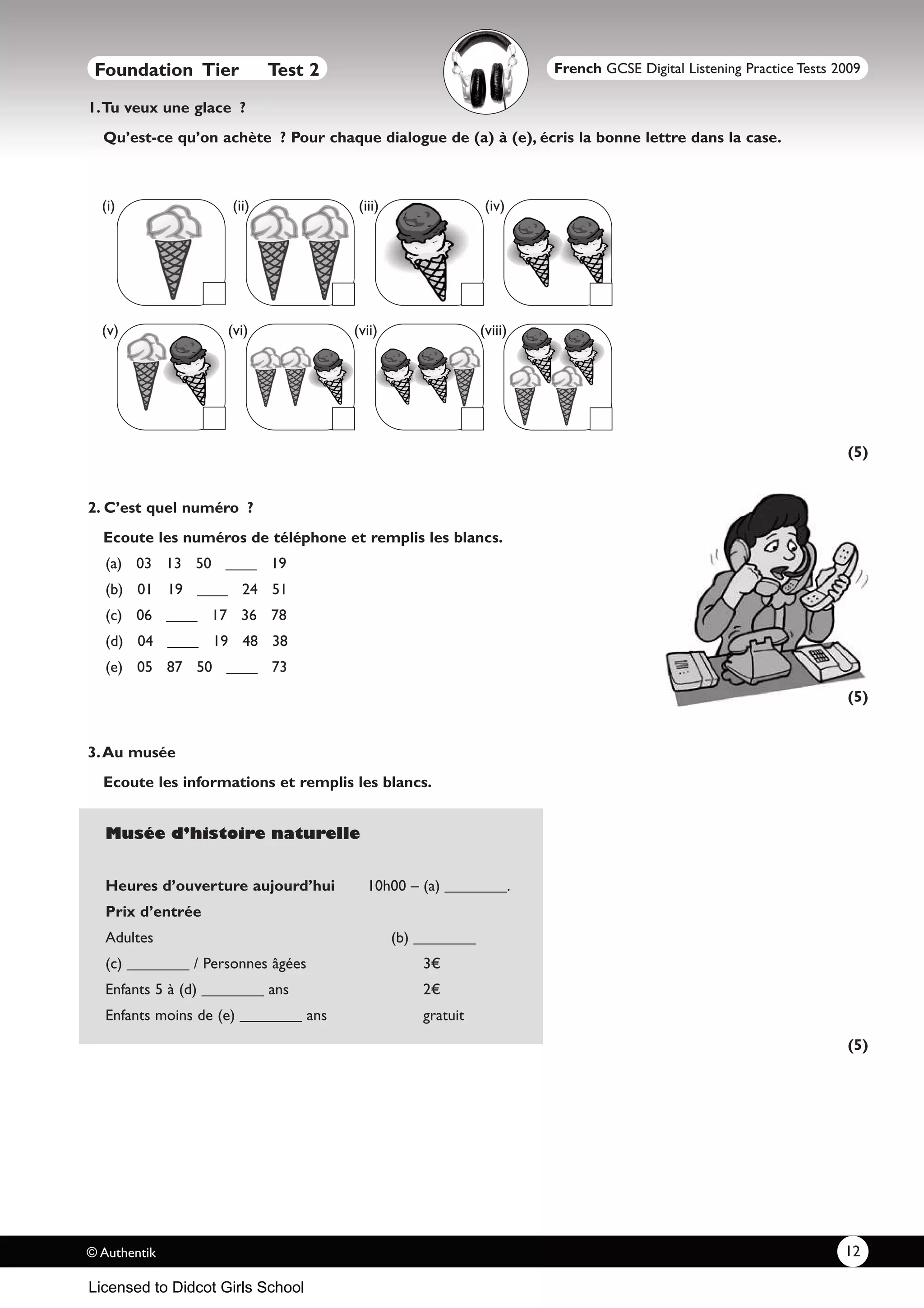 Le document contient une série d'exercices de compréhension auditive pour un test de niveau de français GCSE, comprenant des dialogues, des numéros de téléphone, des informations sur un musée, des vacances idéales et des descriptions d'animaux de compagnie. Les étudiants doivent écouter et remplir les blancs ou choisir les bonnes options basées sur des enregistrements audio. Chaque section est structurée pour tester différentes compétences linguistiques en français.