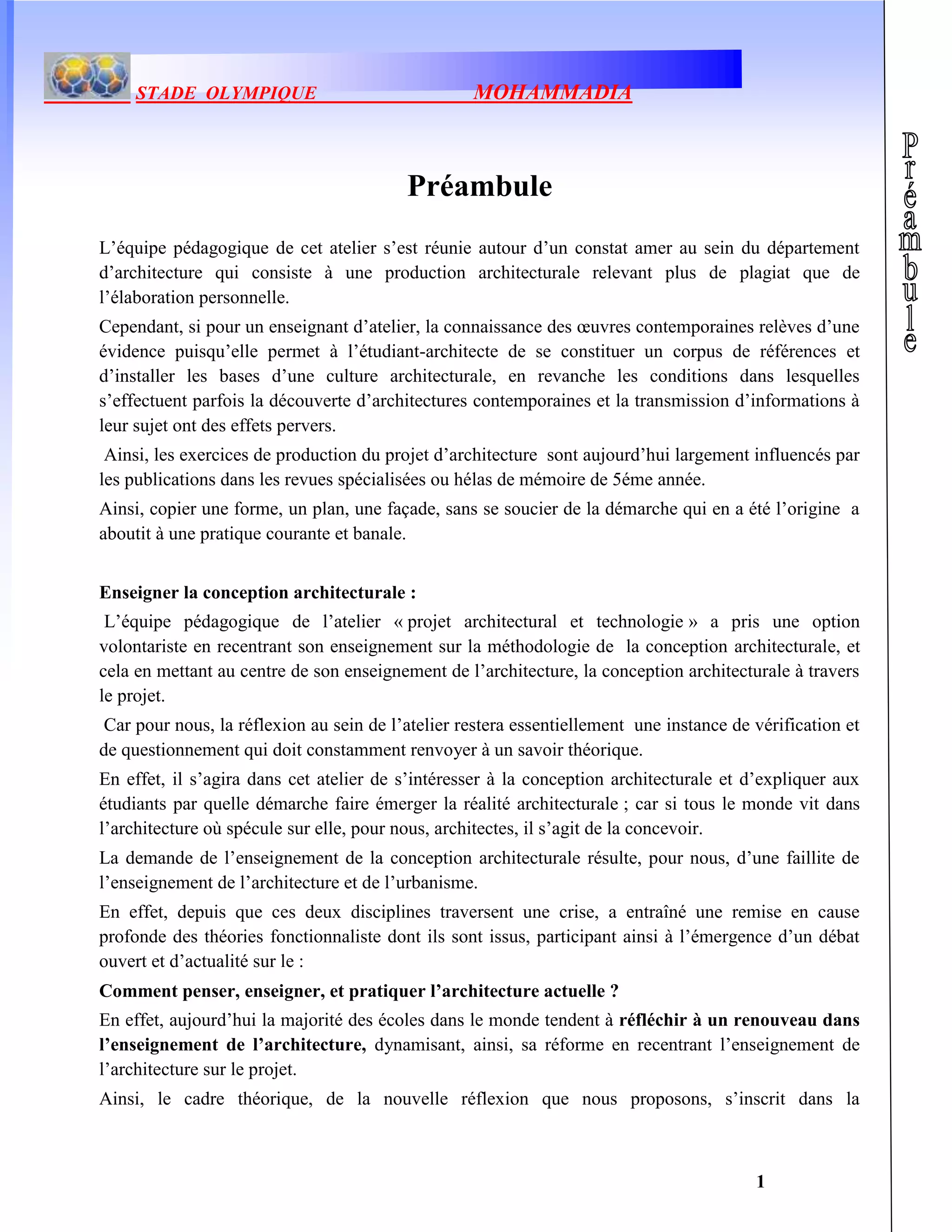 Le document aborde la crise de l'enseignement de l'architecture, soulignant une tendance au plagiat dans la production architecturale actuelle. L'équipe pédagogique propose une réforme centrée sur la méthodologie de la conception architecturale pour revitaliser la formation des étudiants, en insistant sur l'importance de l'innovation et de l'interprétation de l'histoire de l'architecture. L'atelier 'projet architectural et technologique' vise à établir un lien entre théorie et pratique, afin de redéfinir et d'améliorer la conception architecturale face aux défis contemporains.