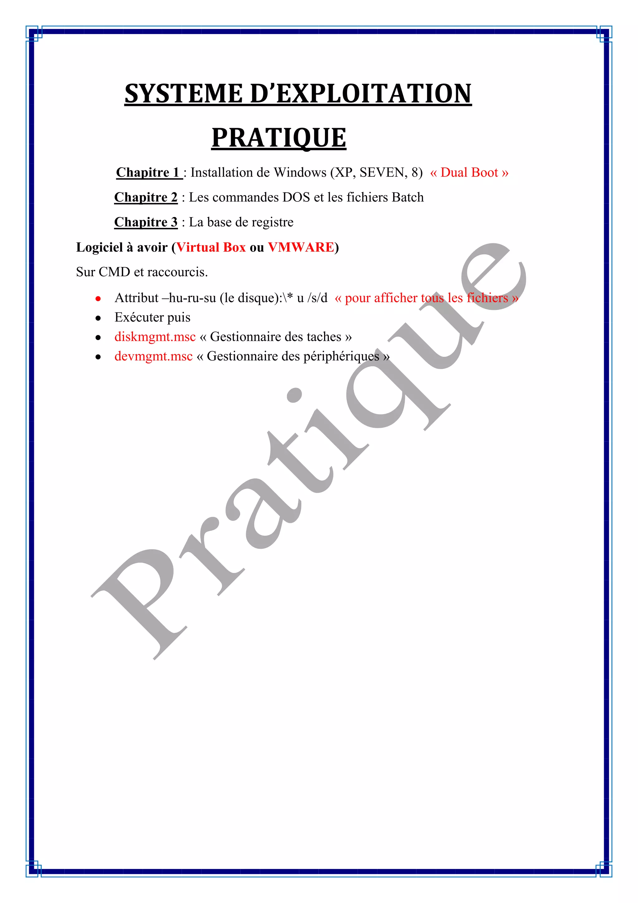 Le document présente un guide sur le système d'exploitation Windows, incluant l'installation en dual boot pour XP, Seven et 8. Il couvre également des commandes DOS, la gestion de la base de registre, et l'utilisation de logiciels de virtualisation tels que VirtualBox ou VMware. Enfin, il mentionne des commandes pour gérer les fichiers et les périphériques via l'invite de commande et d'autres outils de gestion.