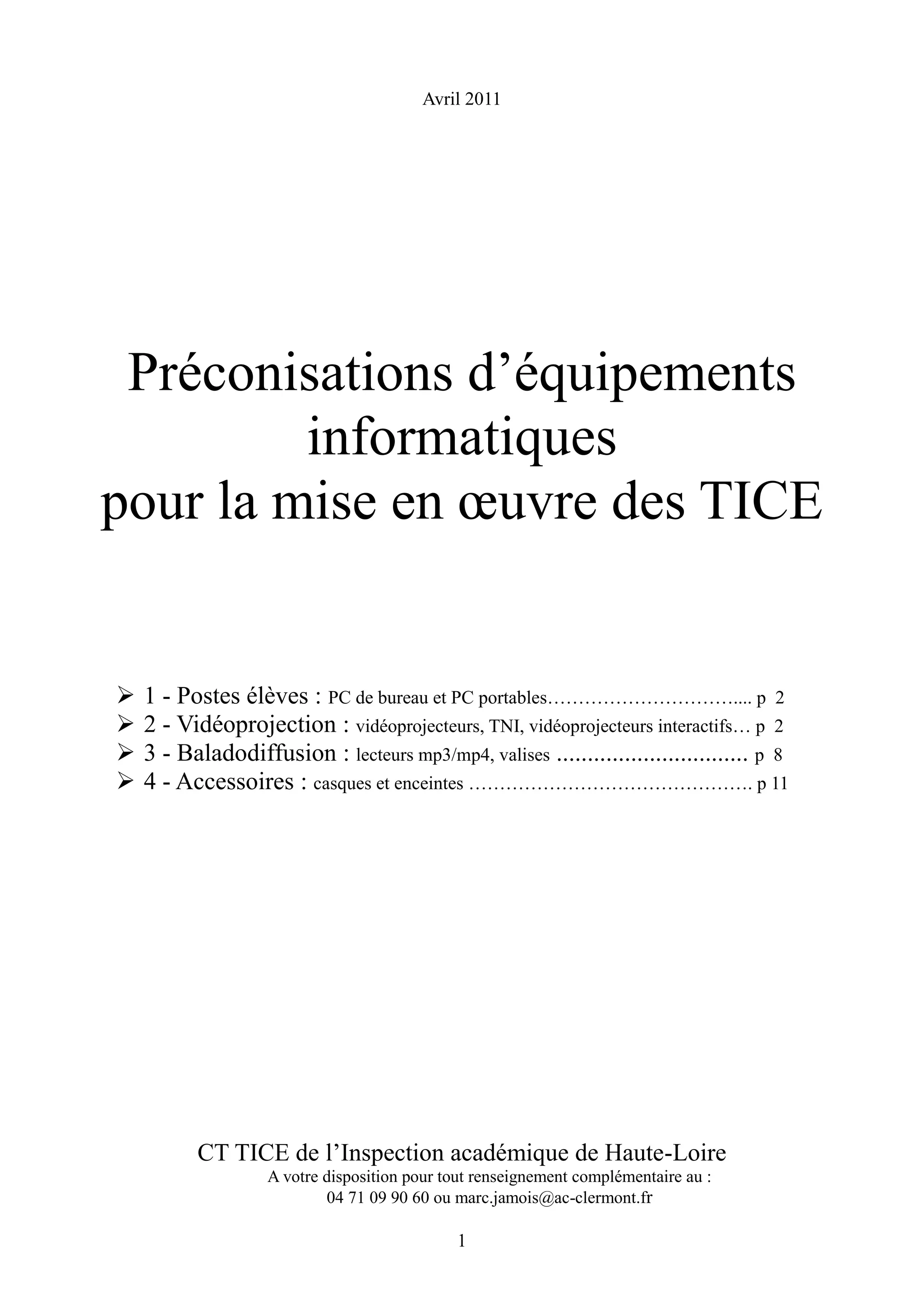 Le document fournit des recommandations pour l'équipement informatique nécessaire à la mise en œuvre des TICE, incluant des postes pour élèves, des vidéoprojecteurs et des tableaux numériques interactifs. Chaque catégorie présente des caractéristiques techniques, des conseils d'achat, et des alternatives. Des informations sur la baladodiffusion et divers dispositifs sont également abordées afin de soutenir l'apprentissage en classe.