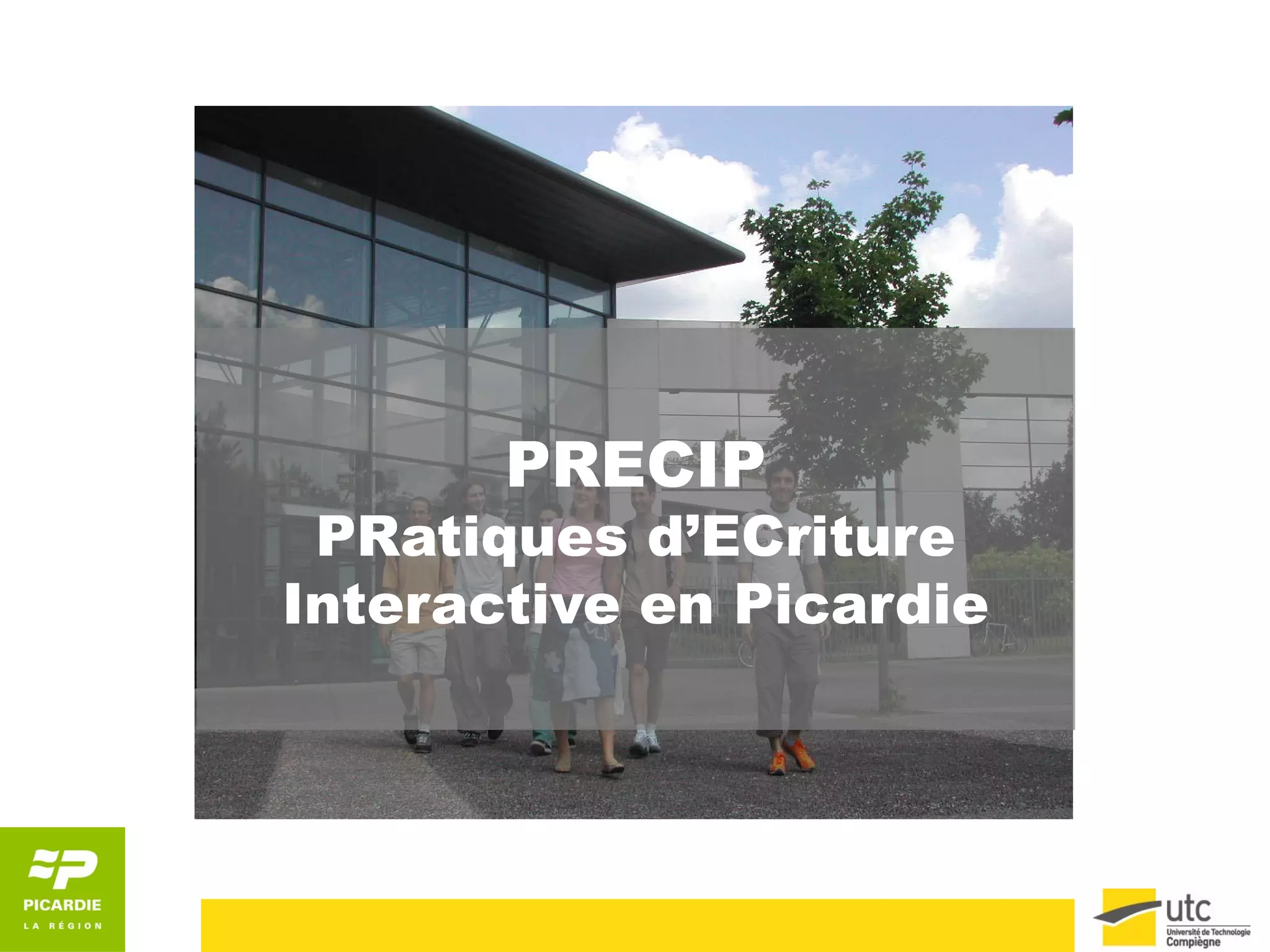 Le projet PRECIP vise à analyser et promouvoir les pratiques d'écriture numérique en Picardie pour réduire la fracture numérique, en s'intéressant particulièrement à l'écriture collaborative et multimédia. Il se concentre sur le développement de modules pédagogiques innovants pour différents niveaux d'enseignement, du secondaire à l'enseignement supérieur. Les objectifs incluent une meilleure compréhension des spécificités de l'écriture numérique et l'impact de la réflexivité sur ces pratiques.